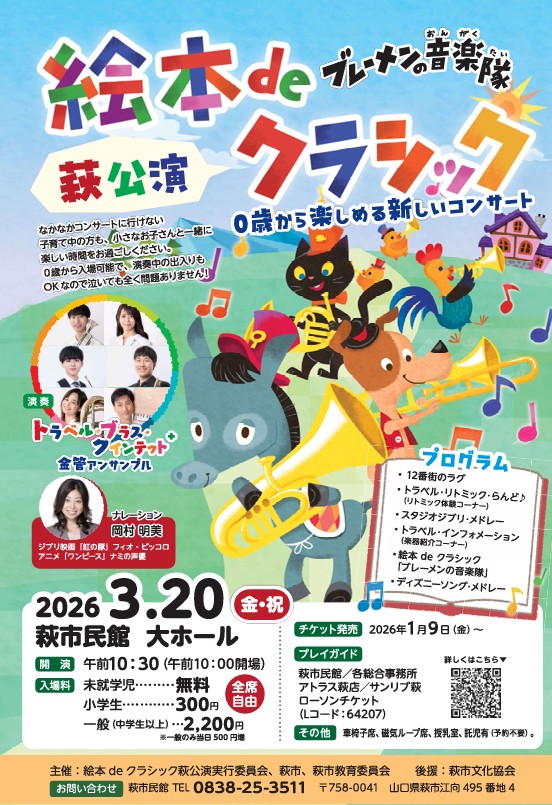 TOP > 子育てカレンダー > 絵本deクラシック萩公演 絵本deクラシック萩公演 開催日時:2026年3月20日 10:30 – 12:00 表示項目:Array参加費:中学生以上2200円・小学生300円・未就学児無料お問い合わせ:萩市文化・生涯学習課イベントサイト:https://www.city.hagi.lg.jp/soshiki/18/h66479.html カテゴリ:イベント 詳細は萩市HPをご覧ください カレンダーページへ